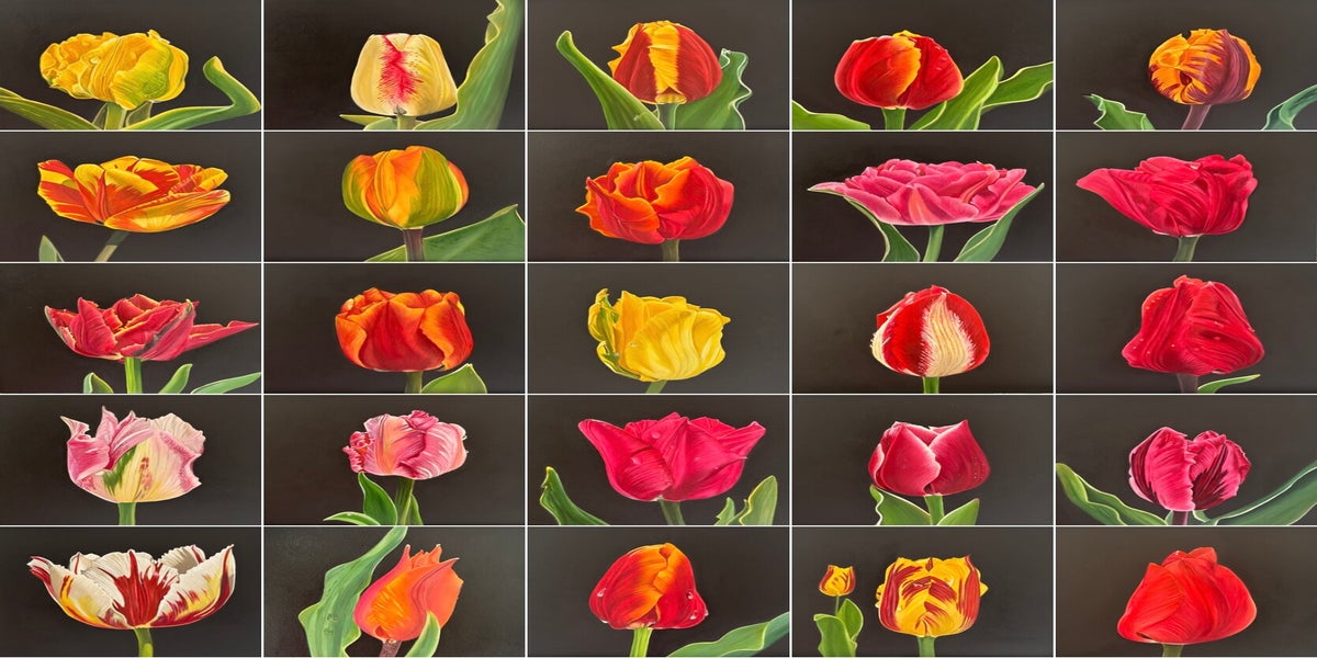 de tulpen zijn geschilderd op paneel 15x15 cm olieverf kosten €345,- per stuk