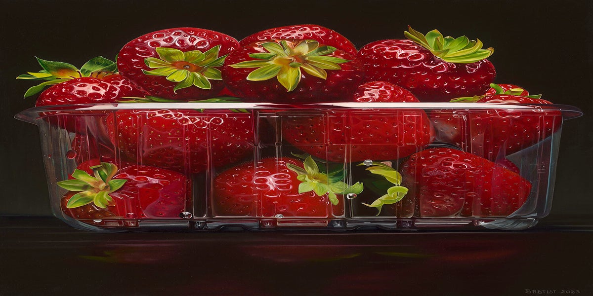 aardbeien in plastic bakje, olieverf op linnen 100x100 €4000,-